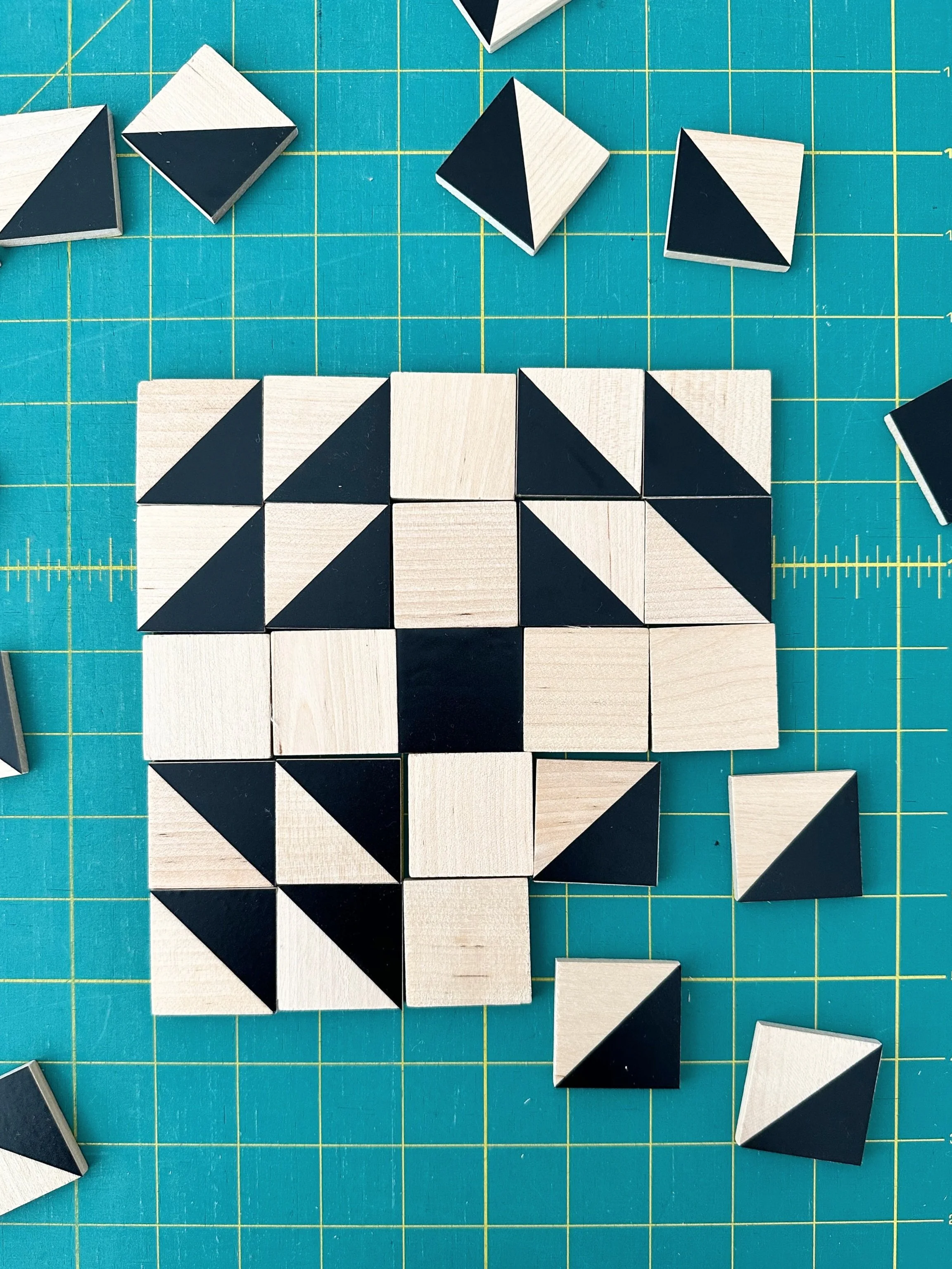 I made my set of pattern tiles using a Cricut machine, but if you don’t have access to one, then I’ve got a blog post about how you can make a similar set of HST and Squares tiles using stamps, paint, or by simply coloring in with a sharpie! You can read that over here: