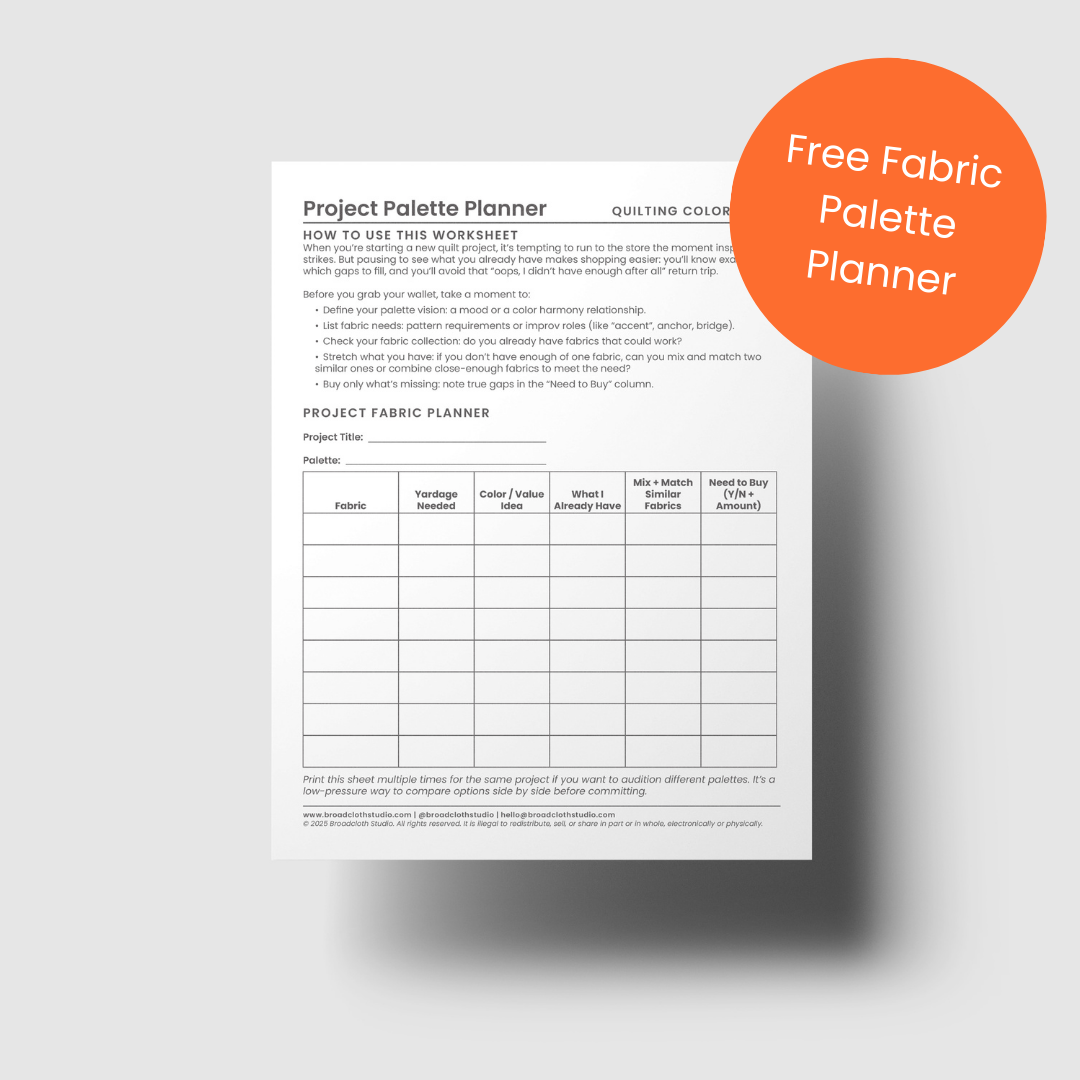 To take the guesswork out of fabric shopping, I pulled together a printable checklist you can use every time you start a new quilt. It helps you see what you can pull from what you already have — and what you actually need to pick up from the shop It’s an easy to use printable worksheet you can use whenever you start a new quilt, where you can capture project, it’s fabric yardage requirements, the color palette you have in mind, what you have on hand already, and what you’d need to buy to make it happen.